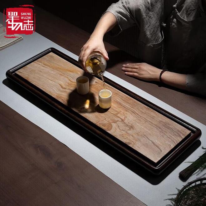圣物志高端珍稀木化石茶盘家用办公室石头茶台黑檀木实木排水客厅茶具盘 56*28*4cm